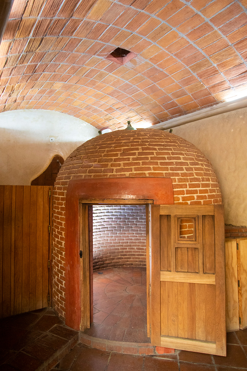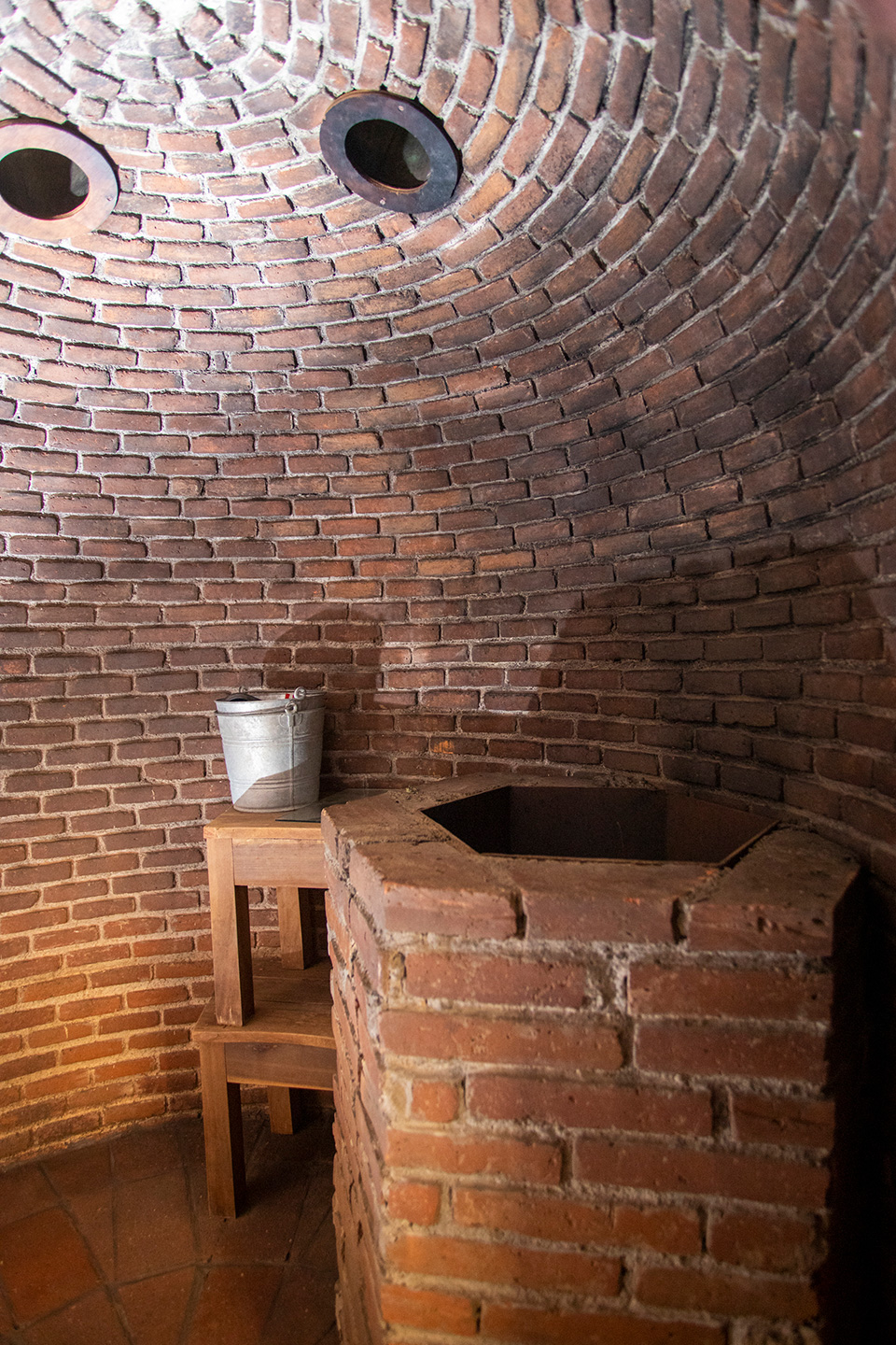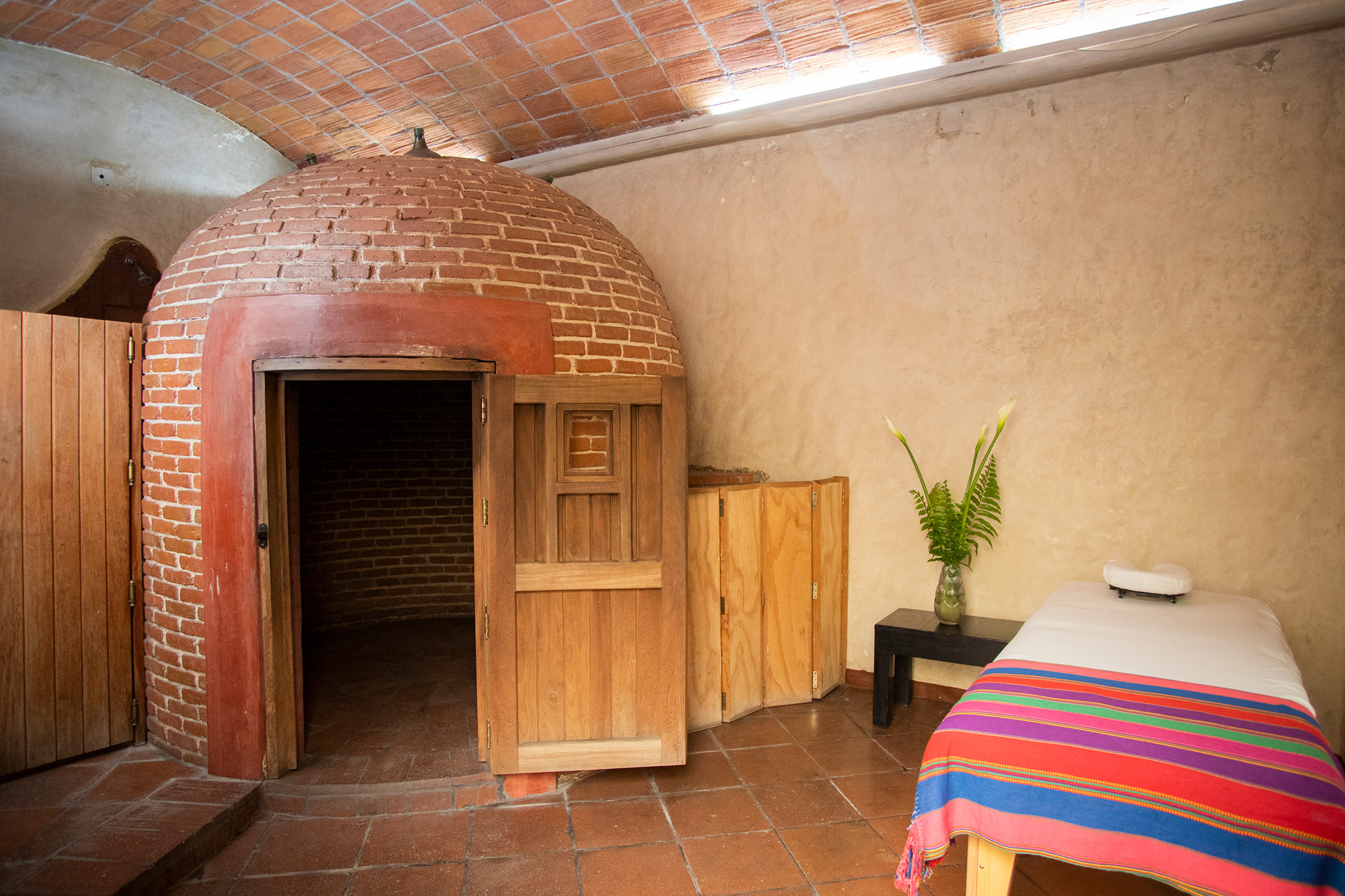 Nuestro temazcal conserva la estructura tradicional de bóveda, con acceso en madera y un interior de ladrillo que mantiene el calor de manera uniforme, permitiendo una sesión profunda, segura y confortable.