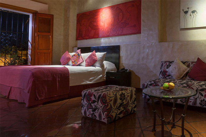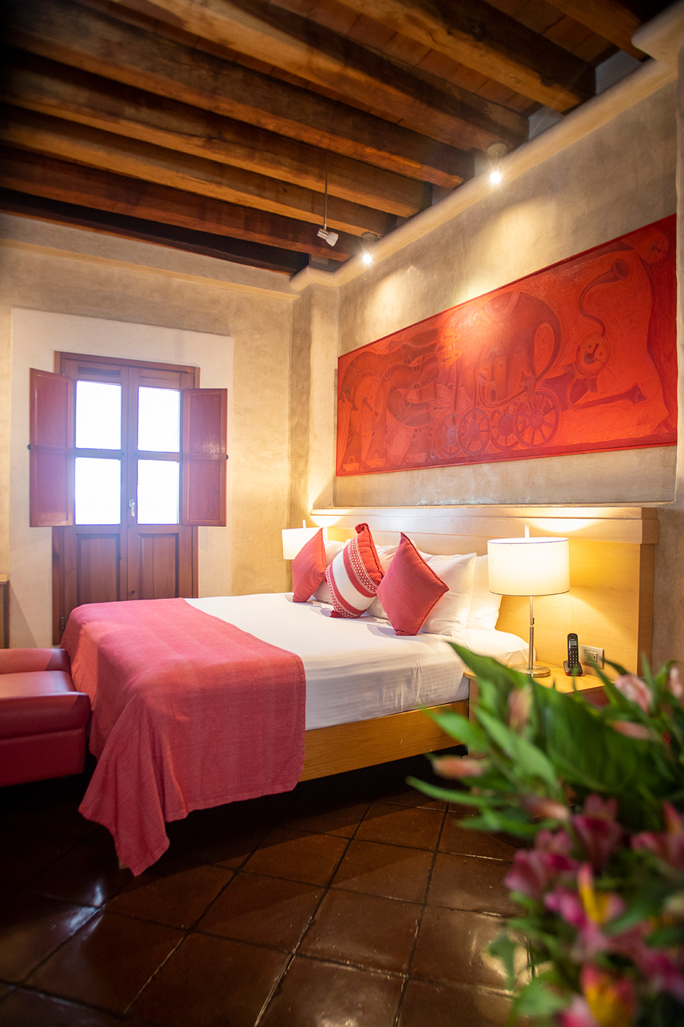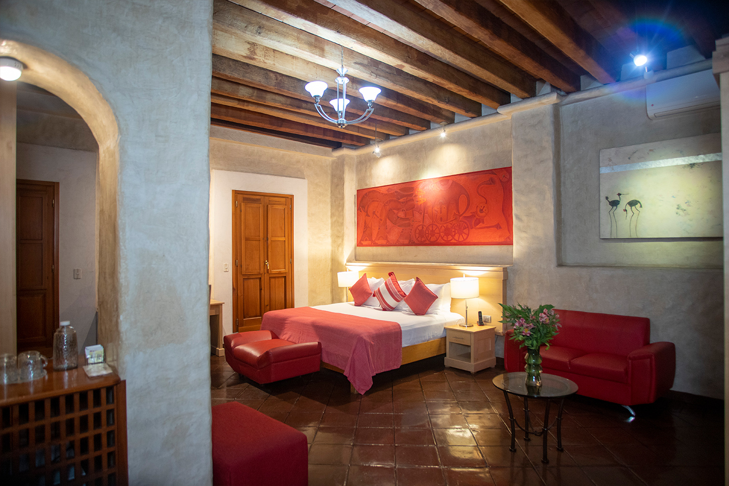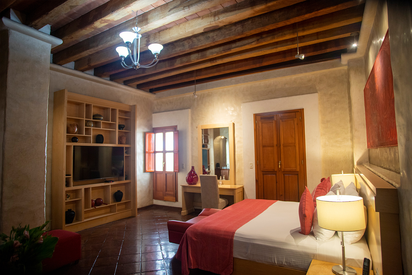 El rojo, símbolo de vida y energía, despierta los sentidos y envuelve esta suite en una atmósfera vibrante y acogedora. Desde su terraza podrá disfrutar un desayuno matutino bajo la luz dorada del amanecer, o contemplar al atardecer la silueta de los cerros de San Felipe del Agua y la cúpula de la Iglesia del Carmen Alto, enmarcadas por el intenso azul del cielo oaxaqueño.