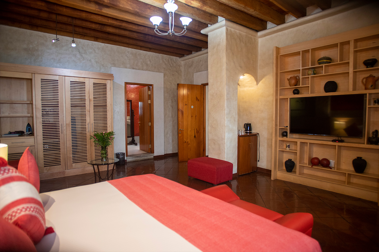Amplia y luminosa, la suite se engalana con dos obras pictóricas en tonos rojos y negros que equilibran la fuerza del color con la serenidad del espacio. Su cama King size, adornada con cojines bordados y una colcha color crudo confeccionada por artesanos oaxaqueños, celebra la maestría textil local.